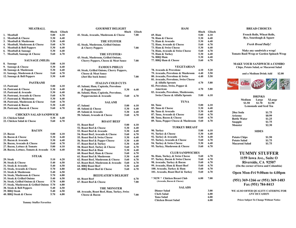 Tummy Stuffer, located in Riverside, CA, is a deli known for its mouth-watering sandwiches. With a wide range of options, including vegan choices, this restaurant offers takeout, delivery, and catering services. Customers rave about the fresh ingredients and friendly staff, making it a must-visit spot for lunch or a quick bite. The Monster and Italian Cold Cuts subs are top favorites, with crispy kosher pickles adding a delightful crunch. The owner, who took over in 2020 after 25 years of service, ensures quality and customer satisfaction. Offering a cozy dining area with country music playing, Tummy Stuffer promises a satisfying sandwich experience. Don't miss out on trying their signature sandwiches like the #98 or Turkey & Cheese, and indulge in a fulfilling meal at this gem in Riverside.